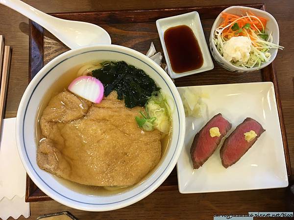 點了一個烏冬麵加2件飛騨牛壽司的套餐1500円, 和一個牛たん串 500円